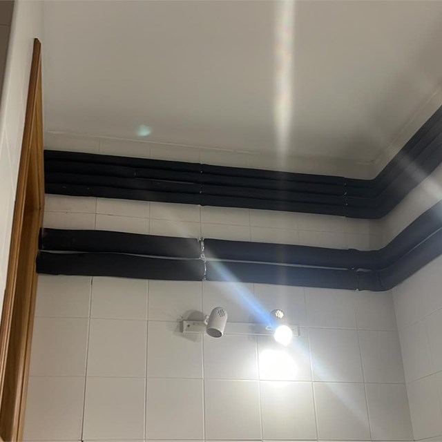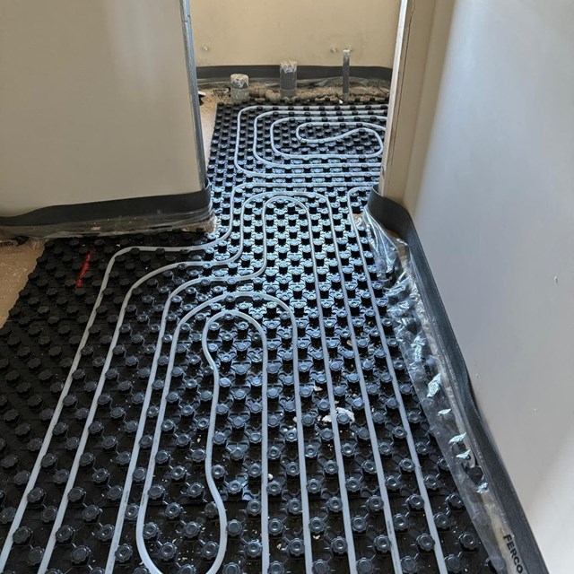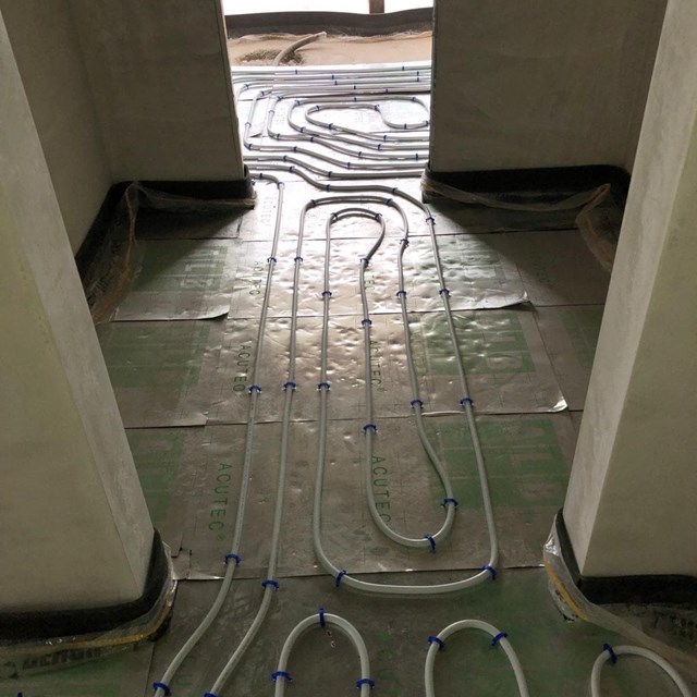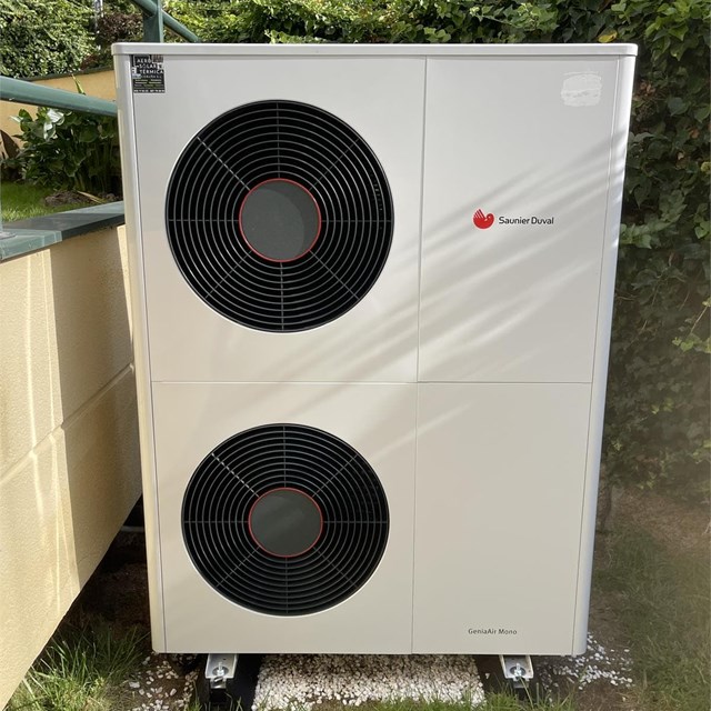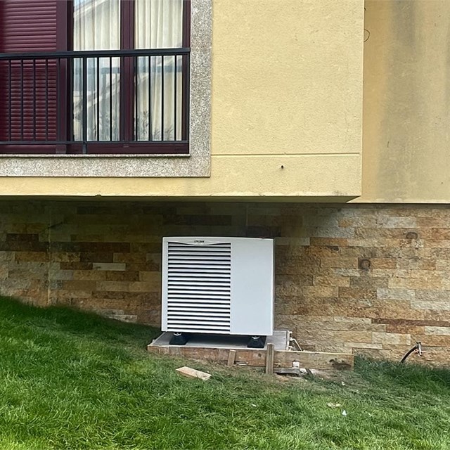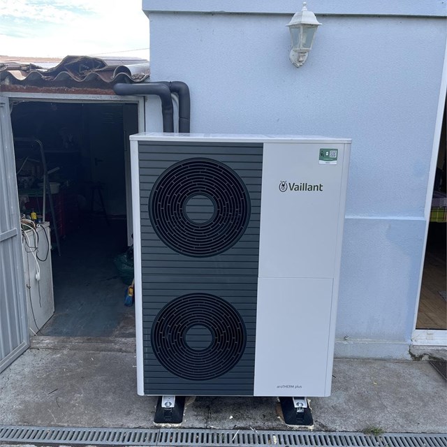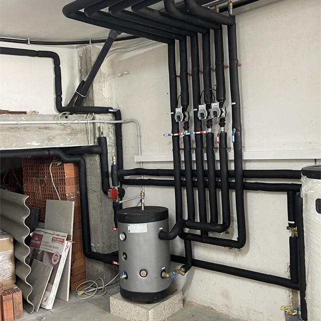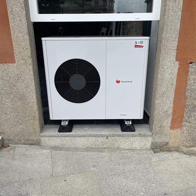 Instalación de aerotermia por bomba de calor marca Saunier Duval modelo Max para calefacción y ACS. Tres zonas independientes para calefacción por radiadores ya existentes en vivienda. Inercia de 80 litros, acero Inox y un acumulador de 200 litros de Inox para ACS.