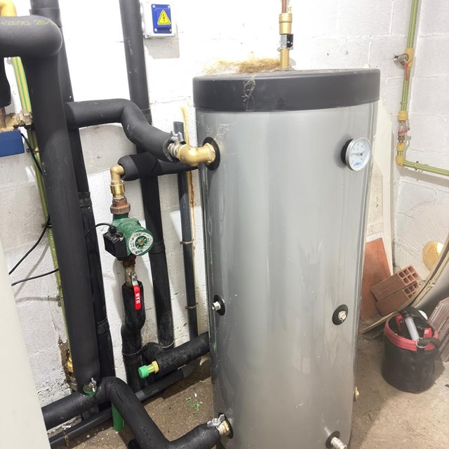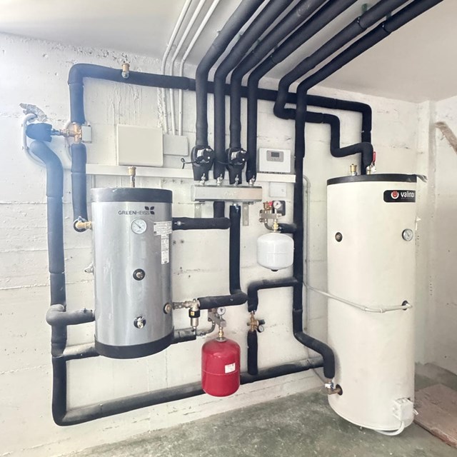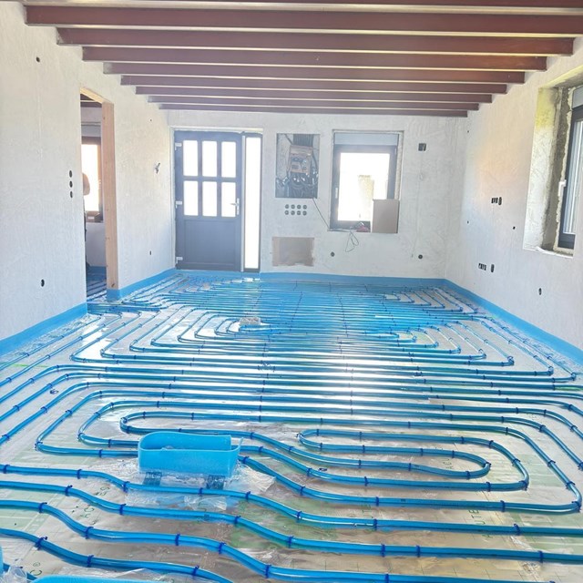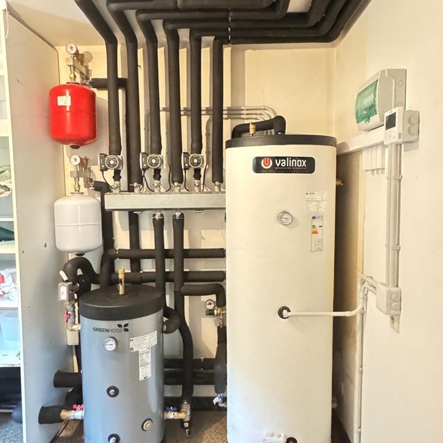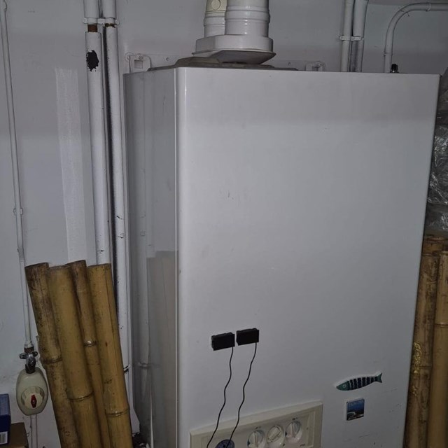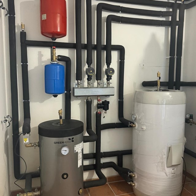 En esta obra, se hizo un cambio de mejora de caldera de gasóleo que trabajaba mediante una zona sola de calefacción y ACS. Por una bomba de calor de la marca Samsung R290. En el interior, por espacio, decidimos poner un depósito de ACS de 200 litros ya conjunto con depósito de inercia de 50 litros,