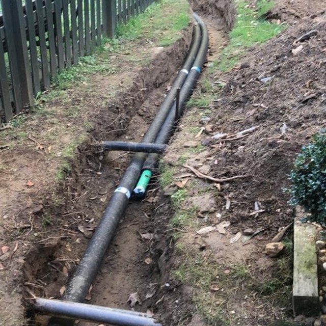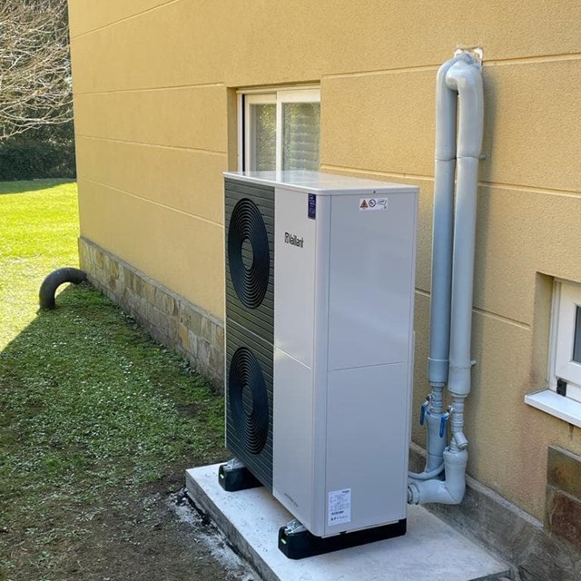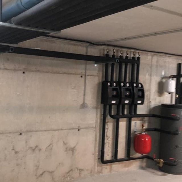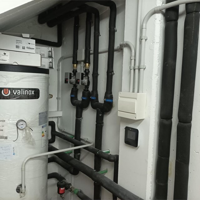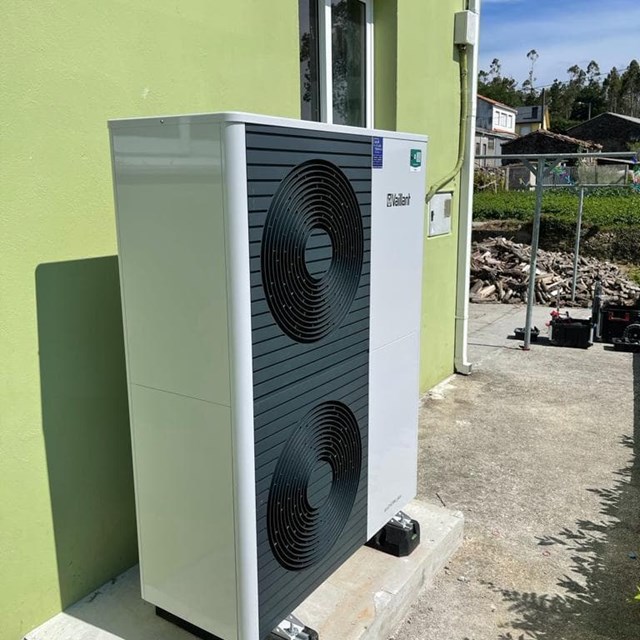 Instalación de aerotermia en cascada para suministro de calefacción con radiadores de fundición existentes en vivienda. Depósito de inercia de 300 litros y acumulador para producción de agua caliente de 300 litros. Bombas de calor saunier duval de 15KW. Obra Oleiros. Coruña.