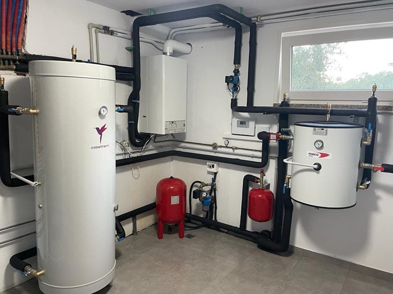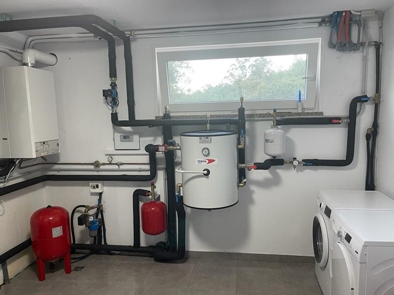 Instalación de aerotermia de Saunier Duval de 12 KW max. Para calefacción y ACS. Obra en Brión de arriba. Serra de Outes.